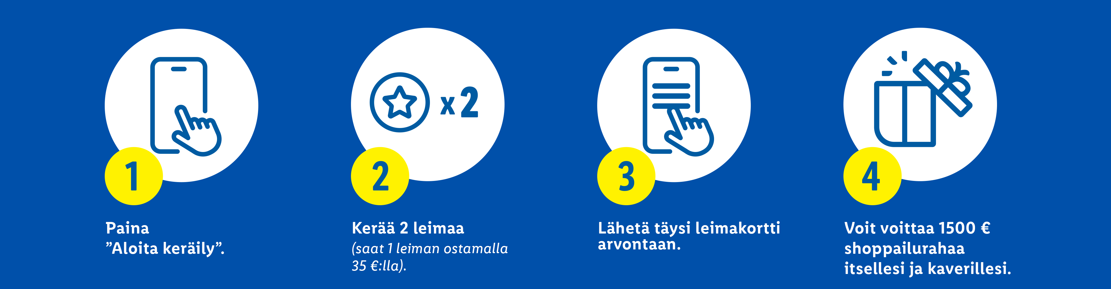 Osallistu kisaan Lidl Plus -äpissä keräämällä leimoja ja lähettämällä täysi leimakortti arvontaan. Paina ”Aloita keräily”, niin saat leiman jokaisesta vähintään 35 euron arvoisesta ostoksesta, jonka teet 12.–25.2.2026. Muista skannata Lidl Plus -korttisi kassalla ostoksia tehdessä. Kahdella leimalla pääset mukaan arvontaan. Ostosaldoa eivät kerrytä alkoholi- ja nikotiinituotteet, pantti eikä lahjakortin ostaminen.