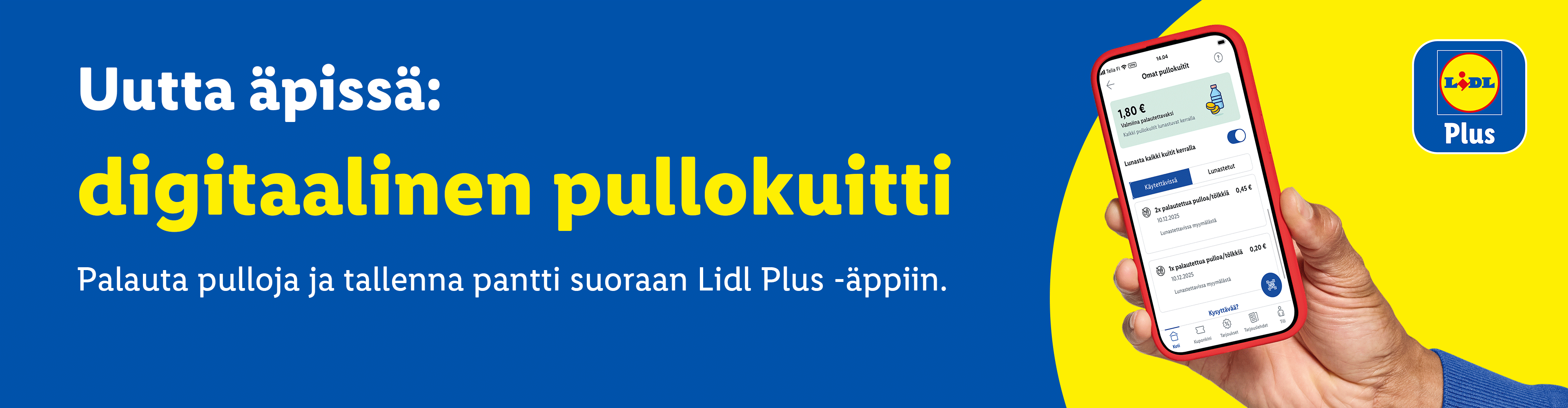 Digitaalinen pullokuitti on Lidlin digitaalinen panttijärjestelmä. Se on kätevä tapa vastaanottaa pullonpalautuskuitit digitaalisesti suoraan Lidl Plus -äppiin ilman tarvetta paperiselle kuitille.