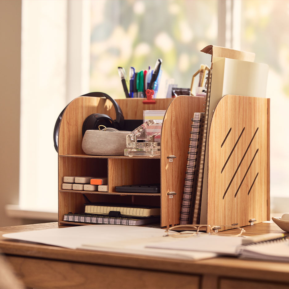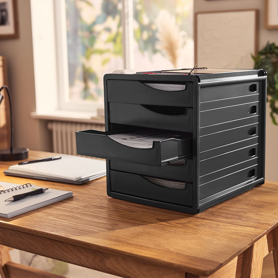 Luo itsellesi säilytysjärjestelmä mapeista, rullalaatikostoista ja kirjoituspöydän säilytyslaatikoista, joissa kaikki on käyttövalmiina aina kynistä tärkeisiin laskuihin. Muista myös seuraavat seikat: