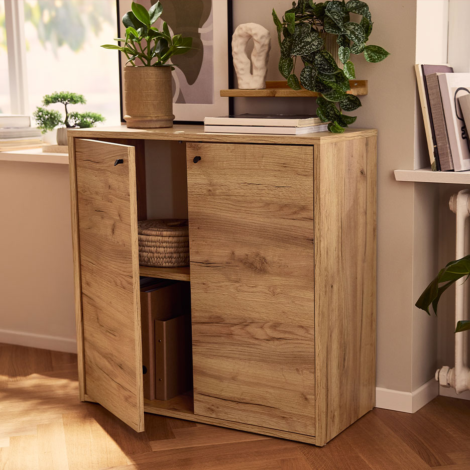 Tasot tai suljetulla etuosalla varustetut lipastot saavat aikaan rauhallisen vaikutelman riippumatta siitä, vallitseeko ovien takana epäjärjestys. Jos pidät avoimista hyllyistä, kaikenlainen krääsä on helppo piilottaa hyvännäköisiin, tekstiilipintaisiin säilytyslaatikoihin ja -koreihin.
